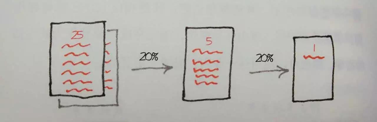 再看这幅图。你要把80/20原则不断贯彻,就是从所有迹象中找出你的20%,然后再从这20%里找出20%。找出关键中的关键,直到找出那件最重要的事情。这是一个很重要的思维模式。