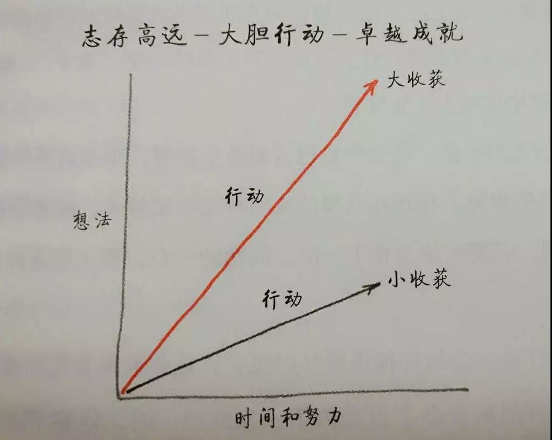以前,我们不断进行各种论证,还不如这幅图来的简洁。同样的行动,一样的行动时间,一样的努力,你的想法好了,斜率就高,想法差了,斜率就低。